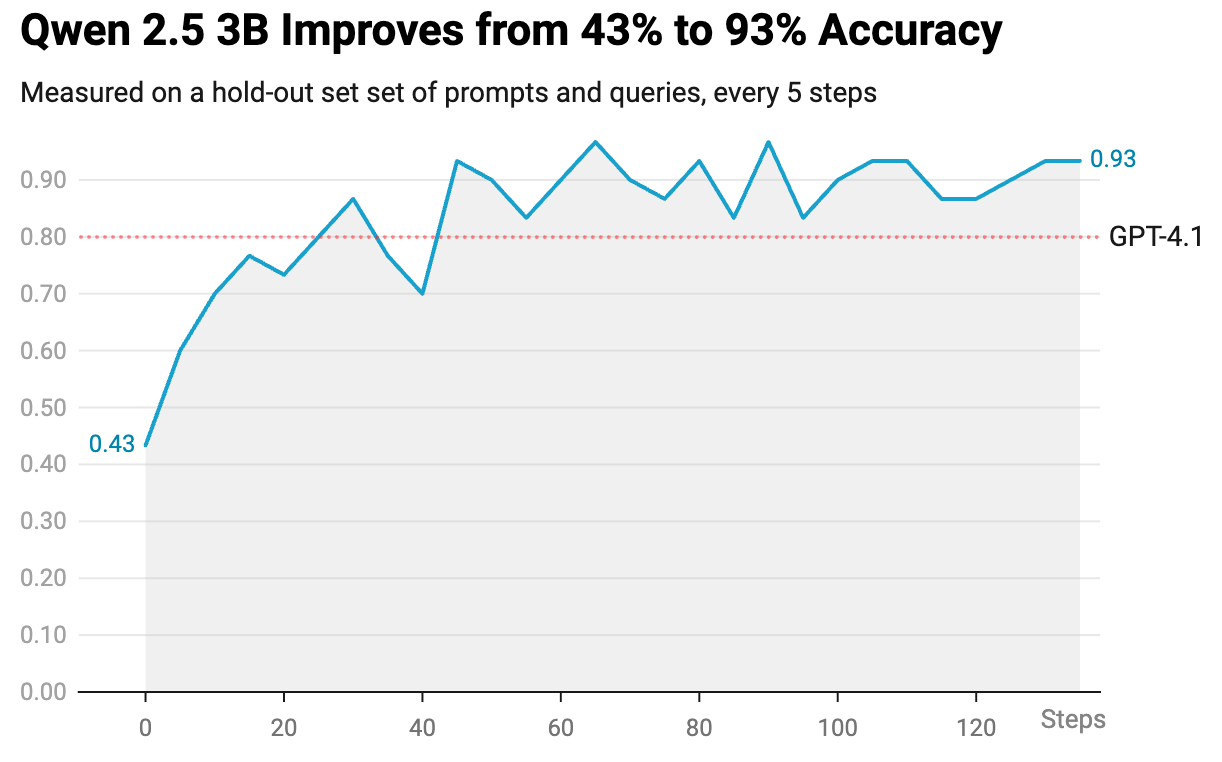 I then RL fine-tuned the Qwen model for a few hours on a single A100, and it went up to an accuracy rate of 93% while dropping its p95 latency to 1.1 seconds. In other words, it transformed the model into a genuinely useful product with frontier level performance at 3x the speed.