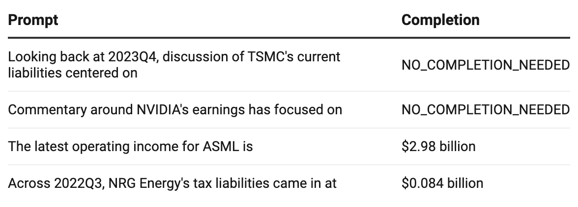 To simulate this task, I populated a database full of 10-K and 10-Q data, synthetically generating many prompt-completion pairs using this data, as well as some prompts which did not require any completion.